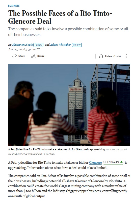 Wall Street Journal: The Possible Faces of a Rio Tinto-Glencore Deal